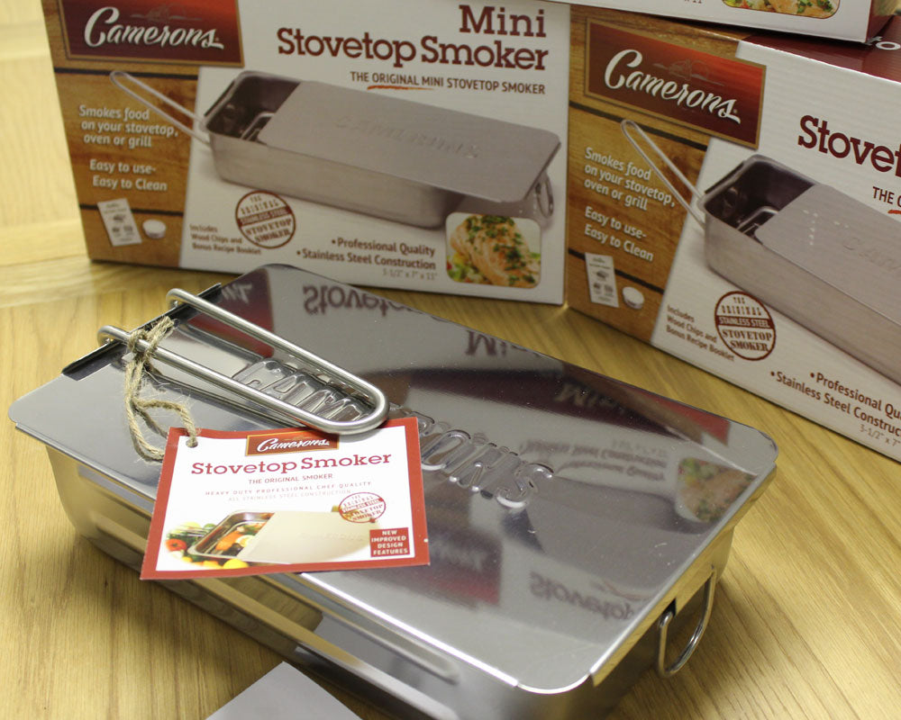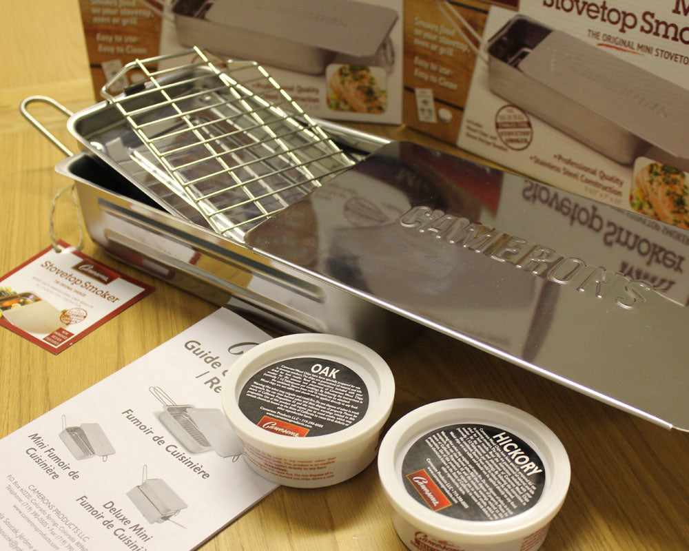 The Cameron mini stovetop food smoker provides an easy way of smoking fish, meat, chicken and vegetables. Made from commercial grade stainless steel makes it easy to clean and ensures it will stand the test of time. Can also be used outdoors on a BBQ or firepit. Makes an ideal gift.Used by Matt Follas winner of Masterchef 2009 to smoke scallops and mashed potato. Stovetop Smoker Details: Dimensions: Width: 7" Length: 11" Height 3" Supplied with Alder & Hickory wood chips, recipes & instructions.
